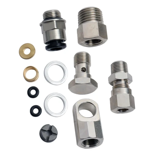 Kit includes banjo bolt, banjo washer, banjo elbow, compression fitting body, outer compression nut, center compression nut, ferrule, spacer, bulkhead body, push-in fitting, 3.5mm copper airline, and o-ring. Does not include 6mm airline.